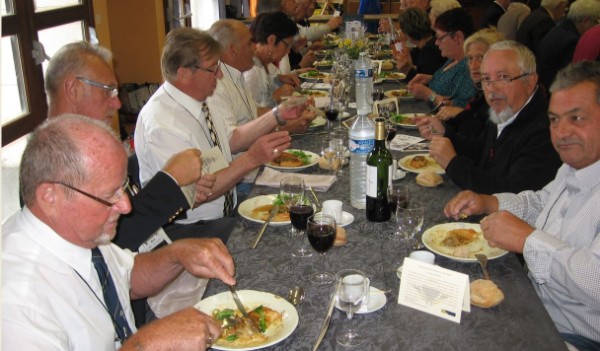 Gérard KAUFMANN en conversation avec Ernest MORIN, , au premier plan René GIROD - le menu de déjeuner de cohésion -