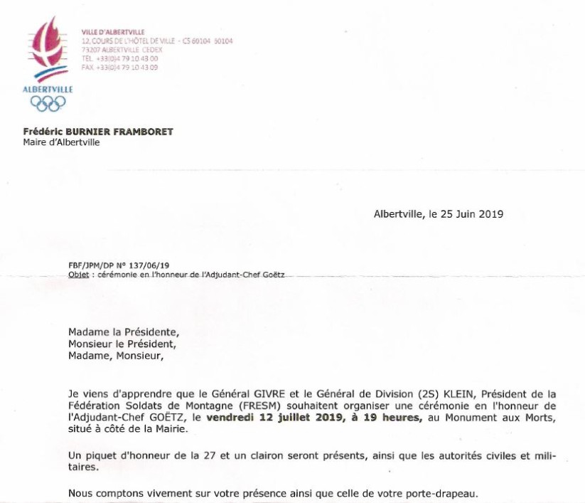 Pays de Savoie - Vendredi 12 juillet 2019, Cérémonie en l'honneur de l'adjudant-chef GOËTZ : le Général GIVRE, le Général de division KLEIN, le Député de la Savoie Vincent ROLLAND, la Sénatrice Martine BERTHET. - Photo de droite, André CHARBONNIER parmi les Porte-Drapeaux.